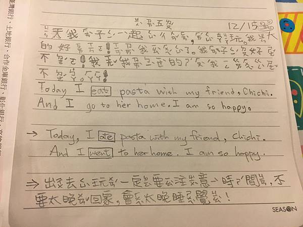 寫在前面因為媽媽在我上小學時就開始讓我寫日記,所以造就我愛說話的性格(?),也讓我未來因為喜歡寫作而得到不少好處,因此希望也能訓練妞妞拿起筆寫作,不但是抒發心情、記錄成長的軌跡,也希望訓練他邏輯思考還有表達能力。妞妞上小學的那一天就帶她去買了一本筆記本,讓她可以天天寫日記,但是這傢伙三天捕魚三十天曬網,日記本就這樣薄薄的一點進展都沒有。這一陣子,因為英文班調整課程,妞妞說他想跟著一起上上去,但班主任很擔心他跟不上前一個年級的腳步,於是和妞妞討論,如果要跟著上上去,到上一個年級的班上課,我們就要開始練習寫作。寫作不但是可以多認識詞彙,能夠加強表達,更重要的是可以多認識單字(無論中英文),還有組織句子成為有結構性的文章,對未來中文也好、英文也好,都有幫助。妞妞今天第二次練習寫中英日記,想說幫她記錄一下。媽媽覺得是很棒,我媽一直說他沒有我優秀(應該是媽媽看自己生的永遠最好的心態),但我覺得他已經很厲害了!:)